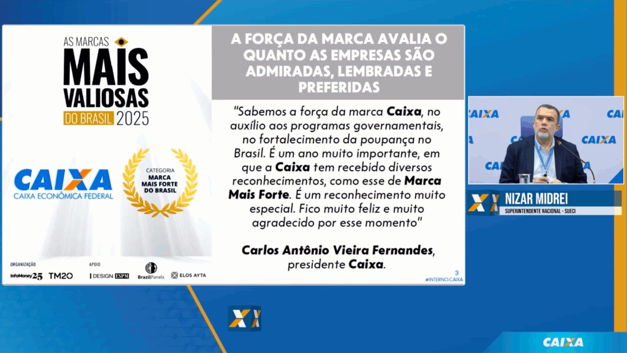 Durante o encontro, o presidente da Anamaco, Cassio Tucunduva, parabenizou a Caixa pelo prêmio recebido em 2025 como uma das marcas mais valiosas do Brasil. “Nós que somos do comércio, somos empresários, receber um prêmio como esse, é como se falasse, nós temos o prazer de trabalharmos no dia a dia. Meus parabéns pelo esforço, e pelos 165 anos, de uma empresa realmente sólida ao longo do tempo, importante para o nosso país, tanto foi no passado e ainda é, e vai ser cada vez mais no futuro, e temos certeza disso aí.”
